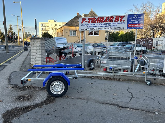 Eladó a képeken látható 3700 mm méretű csónakig alkalmas könnyű, de stabil, horganyzott kivitelű, 1 tengelyes, fék nélküli, torziós, párnafás kivitelű utánfutó. Az utánfutó KNOTT alkatrészekkel van szerelve.